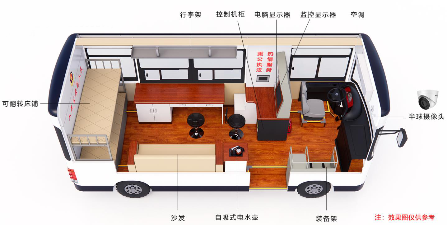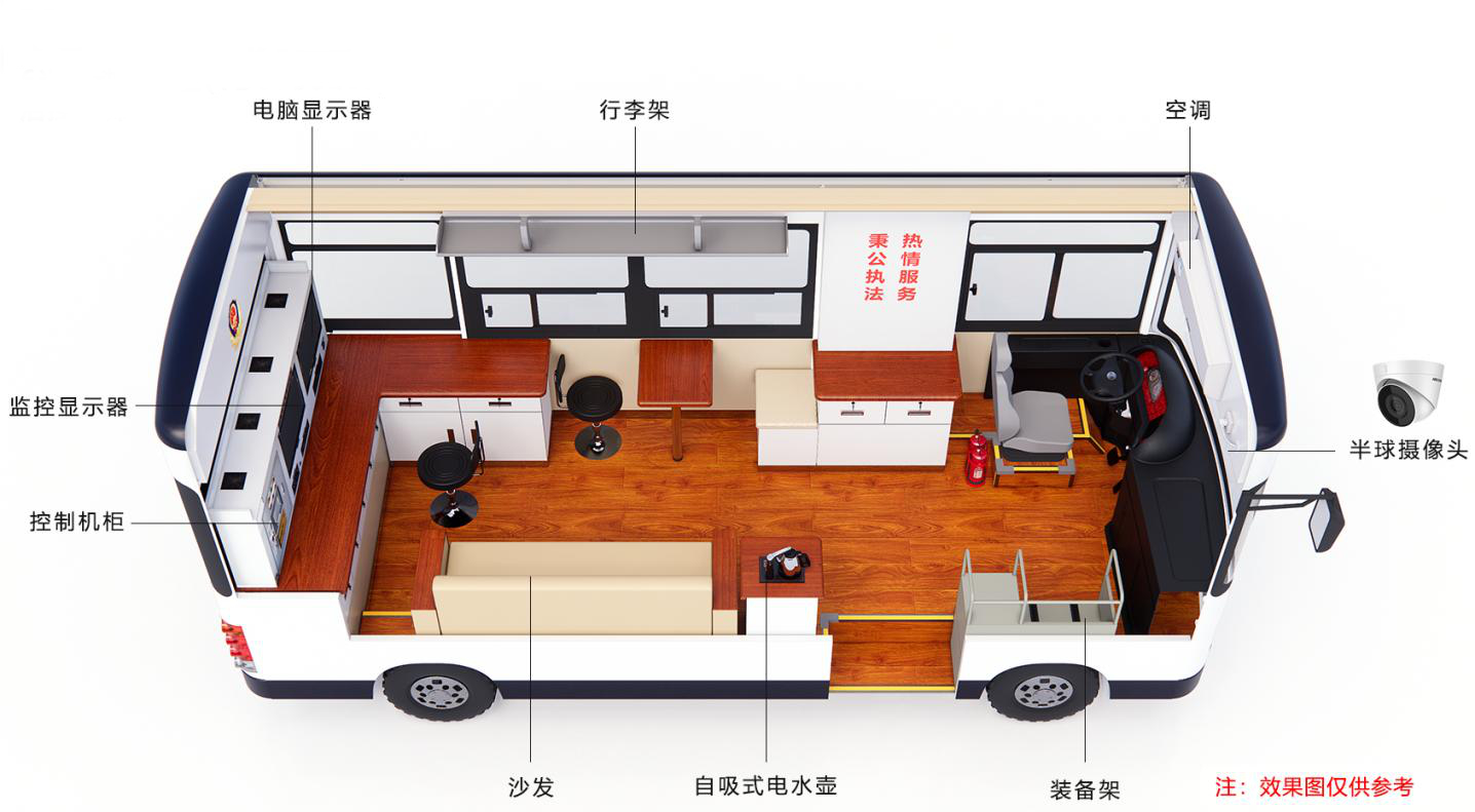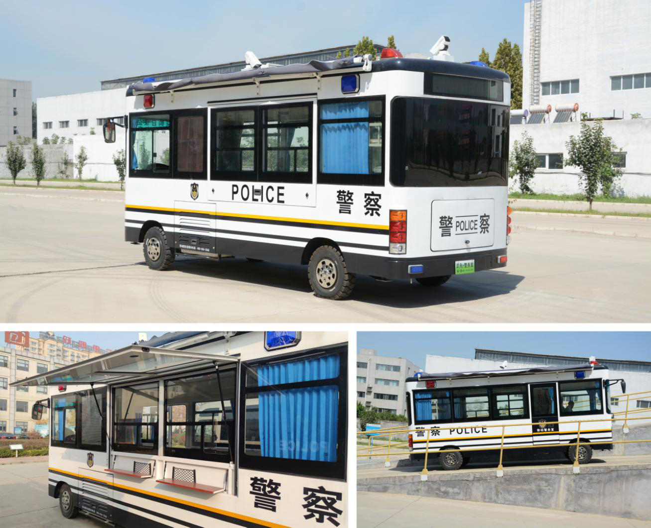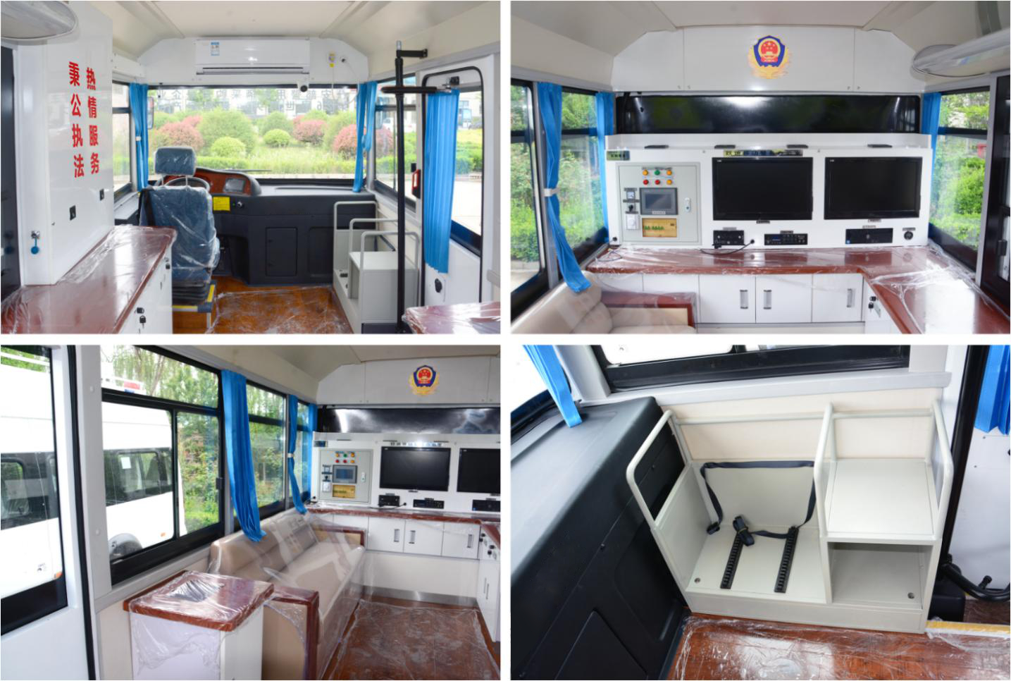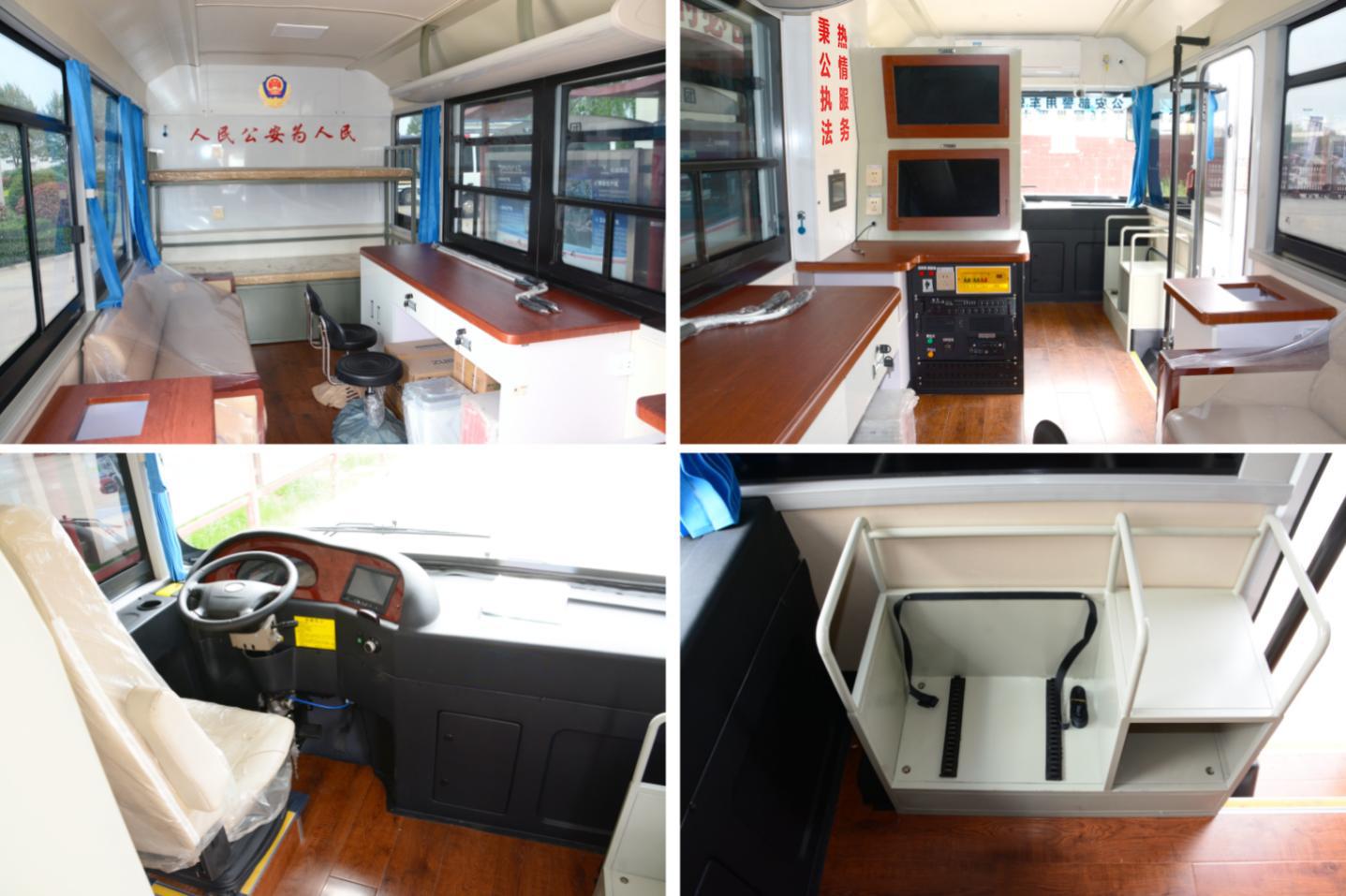 6米移动警务室(电动)根据公安系统特点和移动办公的需求,开发设计的能乘坐一定工作人员的新型警务用车。配备警示宣传系统、警务办公系统、警务通信系统、监控系统、图传系统、供电系统、照明系统及简易生活设备,具有现场办公指挥、应急通信、图像4G传输、现场照明、强声广播、恶劣环境执勤等功能,能满足移动办公、警务前移、检查、卡口、维护治安等需要。